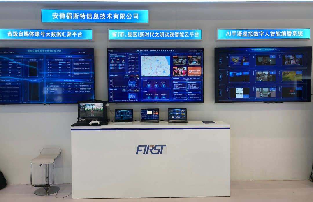 安徽福斯特信息技術(shù)有限公司此次應(yīng)邀參展,以廣電媒體發(fā)展為亮點(diǎn),集中展示大數(shù)據(jù)、人工智能,呈現(xiàn)了AI-VLOG視頻智能合成系統(tǒng)+AI手語虛擬數(shù)字人智能編播系統(tǒng)+省級(jí)自媒體賬號(hào)大數(shù)據(jù)匯聚平臺(tái)+?。ㄊ?、縣區(qū))新時(shí)代文明實(shí)踐智能云平臺(tái)技術(shù)。